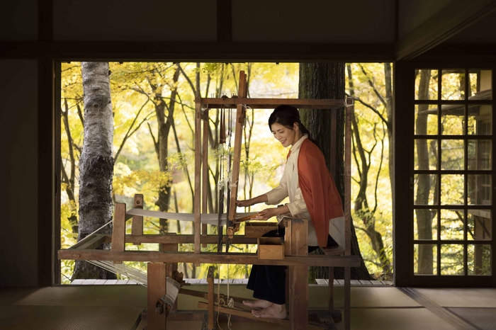 星のや軽井沢内の日本家屋「茶屋」で、窓外に紅葉や黄葉が広がる景色を楽しみながら、上田紬の老舗工房の伝統工芸士(*2)による指導のもと、機織りを体験します。工房が所蔵するさまざまな生地見本と、林檎や葡萄などの樹皮を使って染められた糸を見ながら、自身の織り上げたい柄を考えます。その後、自分の手と足を動かしながら機織り機を使い、約3時間かけて丁寧に織り上げます。自らの感性と感覚を使って機織りの手しごとに没頭することで、心の感度が高まる体験です。さらに、織り上げた生地は、職人が最後の仕上げを行い、数寄屋袋や懐紙入れなどの小物にして後日自宅に届きます。