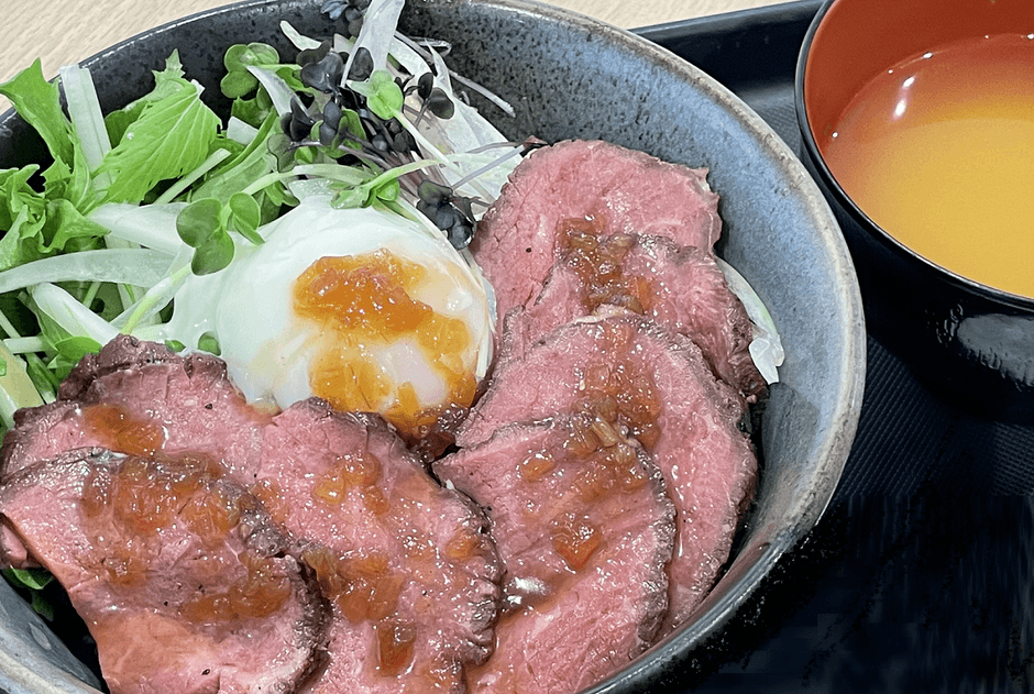 ・温玉のせローストビーフ丼をご注文の方に、通常200円追加の肉増しを