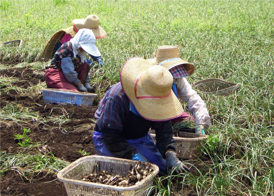 毎年、8月の植え付けから収穫を迎えるまで、じっくりと時間をかけて育ちます。草取り、土寄せ作業から収穫まで、機械に頼らず、ひとつひとつ丁寧に行われています。
