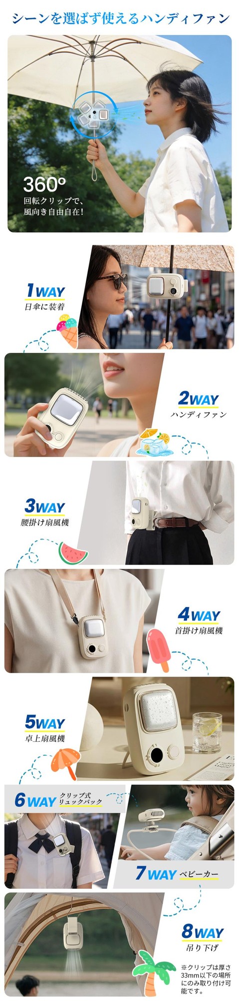 両手を空けたい移動中、デスクワーク中、アウトドア、スポーツ観戦、ベビーカーでのお出かけなど、1台あるだけで夏の快適さが変わります。