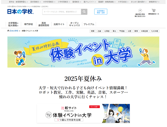 エリア、開催日、開催形式、対象学年、参加費用などの条件で、全国の大学にて実施している未就学児、小学生、中学生向けイベントを検索することが出来ます。