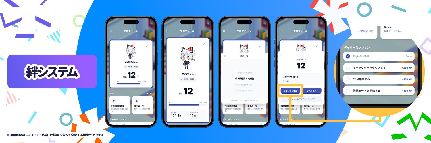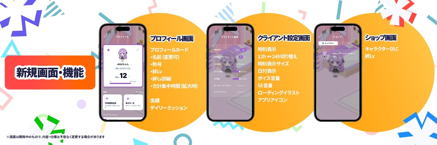 ポモドーロタイマーやストップウォッチを活用した「集中・作業トラッキング」や「睡眠管理」機能を搭載し、推しのVTuberたちがユーザーの日常に優しく寄り添い、毎日のタスクや睡眠の習慣化を楽しくサポートします。