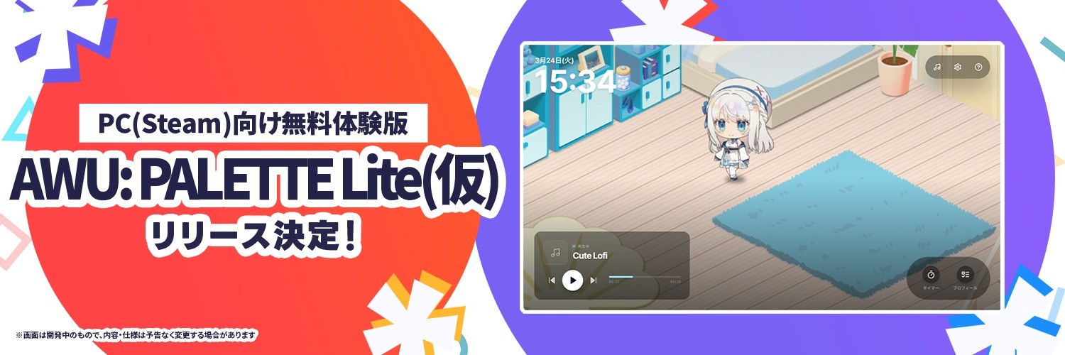 「AWU: PALETTE」をより多くの方々にお楽しみいただくため、PC(Steam)向け無料体験版「AWU: PALETTE Lite(仮)」のリリースが決定いたしました。2026年初夏の配信を予定しています。詳細は今後、公式X(https://x.com/awu_palette)および公式サイトにてお知らせいたします。