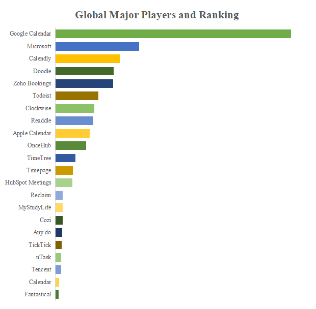 QYResearchのトップ企業研究センターによると、カレンダーアプリケーションの世界的な主要製造業者には、Google Calendar、Microsoft、Calendly、Doodle、Zoho Bookings、Todoist、Readdle、Clockwise、Apple Calendar、OnceHubなどが含まれている。2023年、世界のトップ10企業は売上の観点から約65.0%の市場シェアを持っていた。