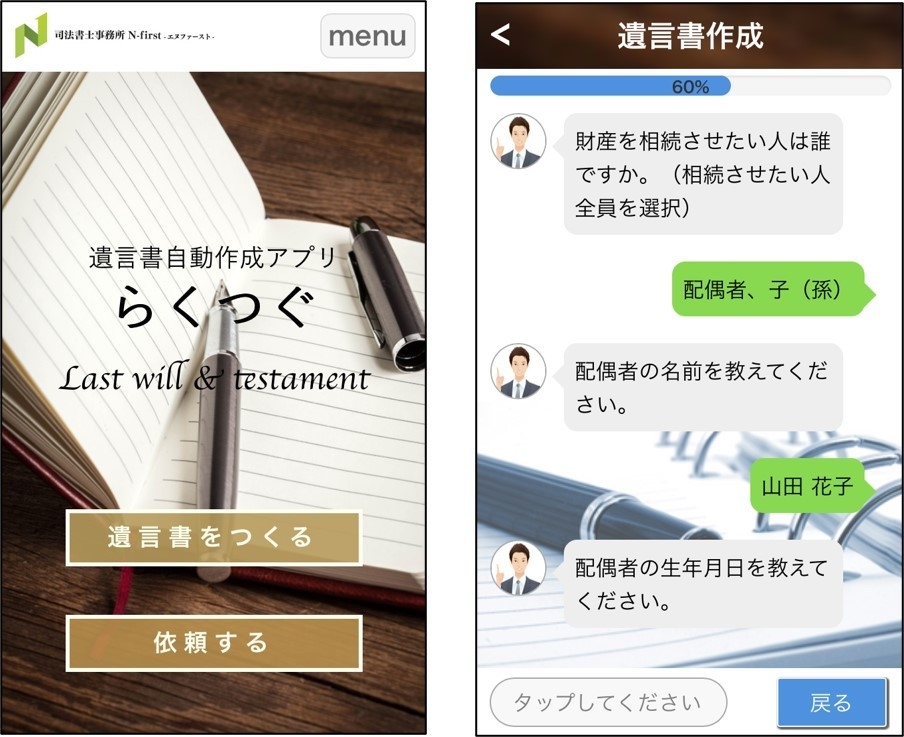 司法書士事務所N-first(エヌファースト)(事務所:東京都台東区、代表司法書士:中田 泰晶)は、10月6日(火)、遺言書が自動で作成できる無料アプリ「らくつぐ」のAndroid版をリリースいたします。煩雑な手続きや法律の知識は不要で、チャットボットの簡単な質問に答えていくだけで手軽に遺言書が作れます。さらに詳細な遺言書を作成したい場合にも、アプリ上から信頼のおける専門家(司法書士)に有償で作成依頼も可能です。昨年末のiOS版に続き、コラムや進捗バー、プッシュ通知などの便利な新機能も搭載したAndroid版の提供を開始します。