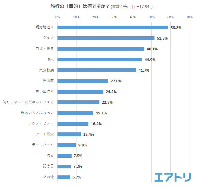 最多回答は「観光地巡り」が58.8%と約6割の人が目的をもって旅に出ることがわかりました。旅の楽しみとして欠かせない「グルメ」が51.5%と5割超えが続き、非日常を味わえる「自然・絶景(46.1%)、」「温泉(44.9%)」、「気分転換(41.7%)」が4割以上という結果でした。