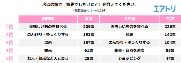 また旅先でやりたいことは、国内旅行でも海外旅行共に「美味しいものを食べる」がTOPとなりました。