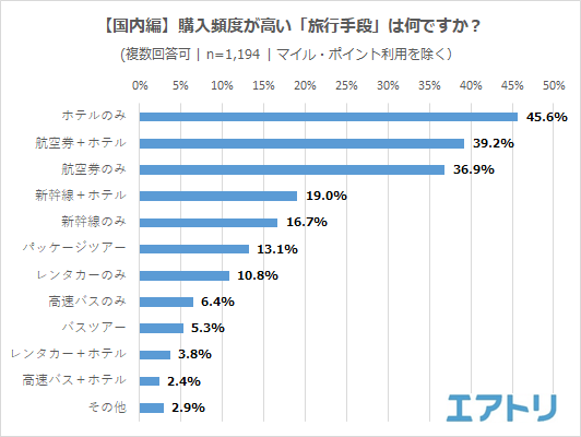 普段利用している国内旅行の手段で最も回答が多かったのは「ホテルのみ(45.6%)」となったことにより、交通手段としては自家用車で移動すると思われる人が多いことがわかりました。次いで「航空券+ホテル(39.2%)」、「航空券のみ(36.9%)」でした。