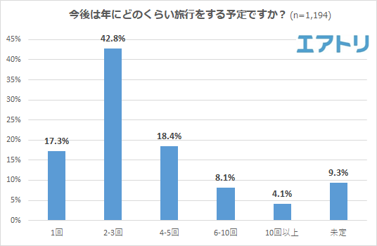 最多は「2-3回」(42.8%)となり、コロナ禍以前と比べても変わらない結果になりました。次いで、「4-5回」(18.4%)、「1回」(17.3%)となりました。