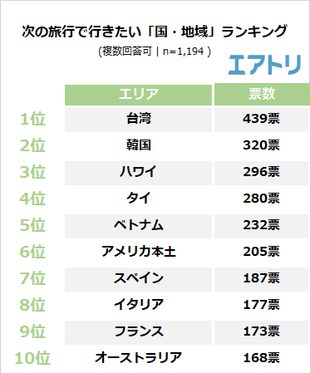 119票もの差をつけて1位になったのは「台湾(439票)」でした。続いて2位「韓国(320票)」、3位「ハワイ(296票)」となりました。