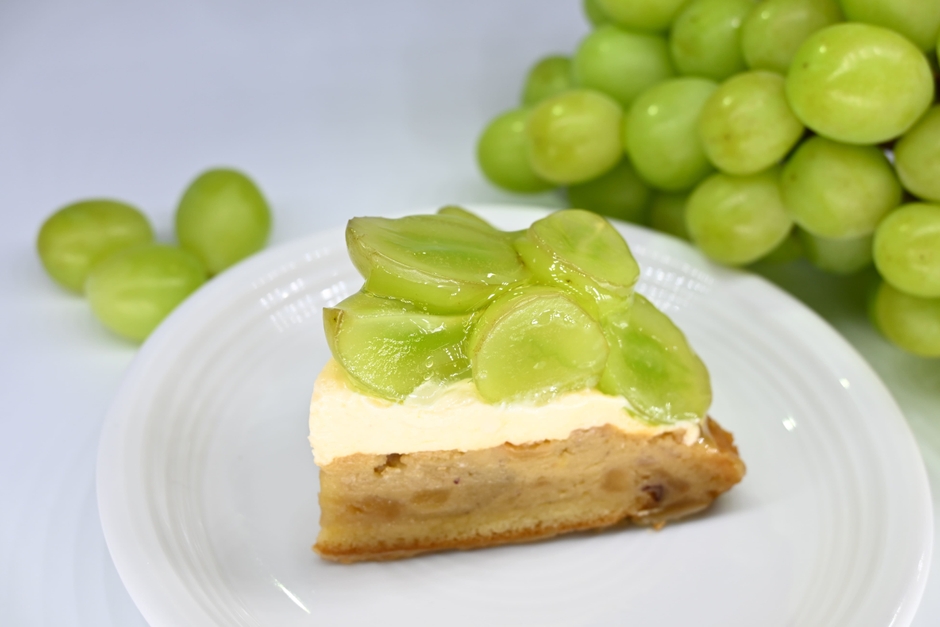 お芋とりんごの角切りがゴロゴロ入ったタルト生地にカスタードクリームを絞りその上に旬のフルーツをたっぷりのせて仕上げております。8月は旬のシャインマスカットをのせたタルトを期間限定販売いたします。