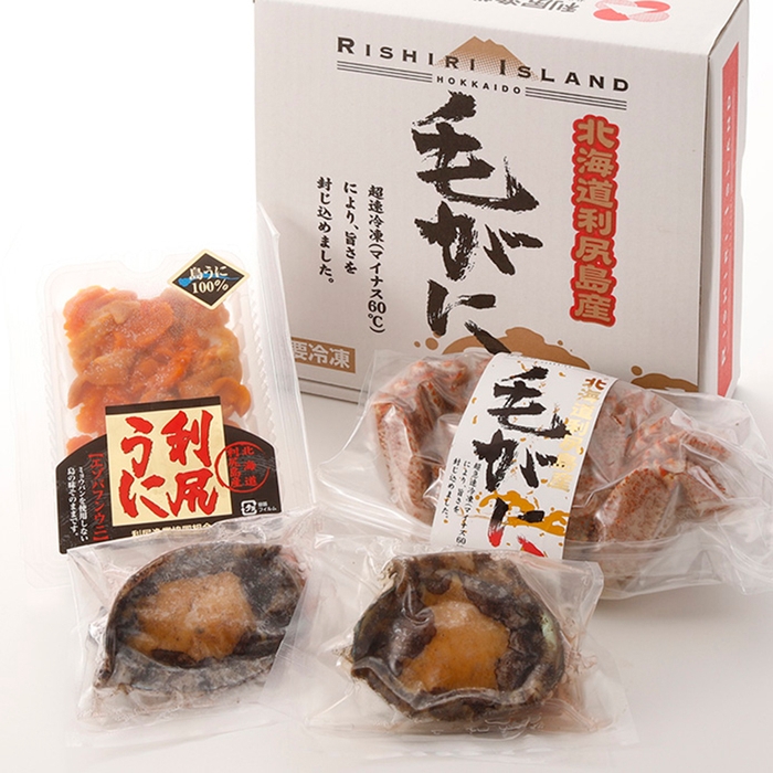 今回はその利尻島から、獲れたてを急速冷凍し旨味を閉じ込めた毛ガニと、最高級の利尻昆布を餌にして育ったバフンウニ、さらにコリコリとした食感と甘みが特長のアワビをセットにしてお届けいたします。