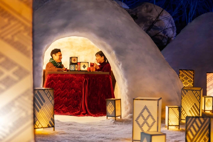 津軽の季節の風情を楽しむことができる「津軽四季の水庭」に伝統工芸「津軽こぎん刺し」のでデザインを施した灯籠が照らす「こぎんかまくら」が登場します。プライベート感あるかまくらの中では、こぎん刺し模様のお菓子や、りんごのカクテルを楽しみながらゆったりと過ごすことができます。