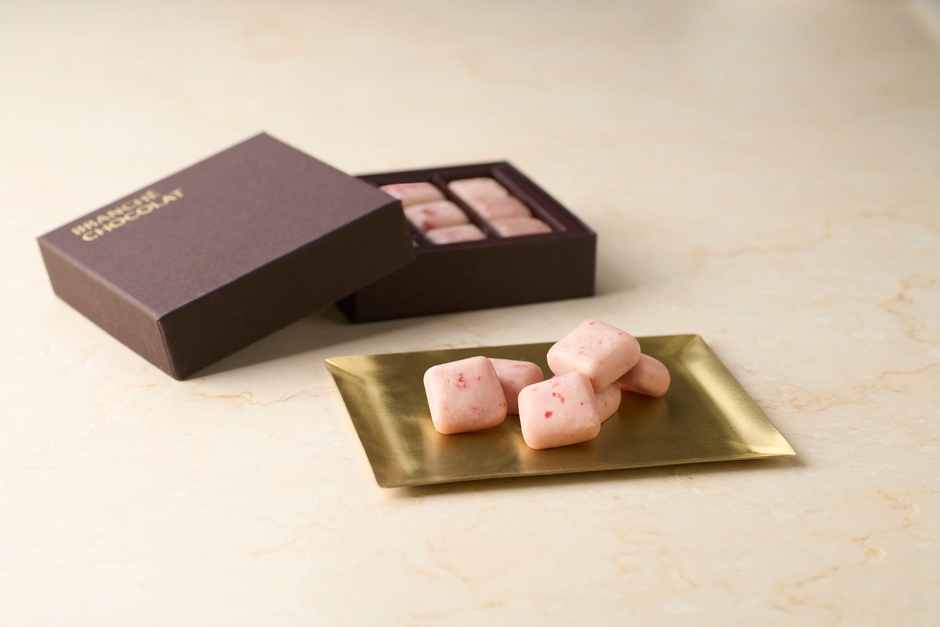BRANCHE CHOCOLATの人気商品、「苺のカレ・オ・ショコラ」を一口サイズの生チョコレートに仕立てました。苺をそのまま味わう以上に苺の魅力が伝わる、エレガントな雰囲気を纏った「古都華いちごの生チョコレート」。