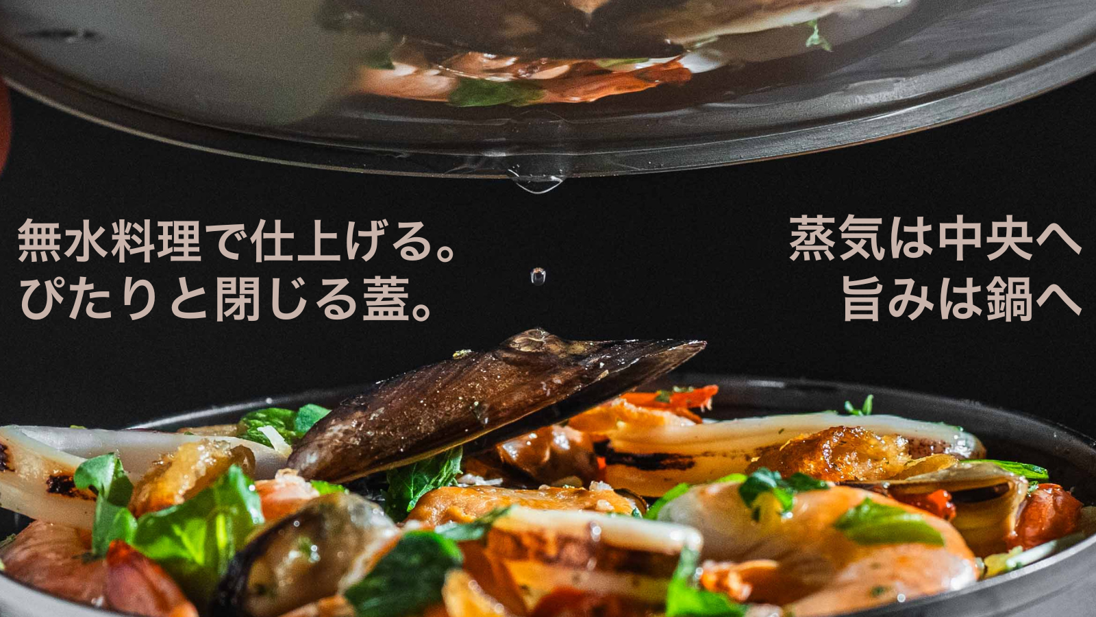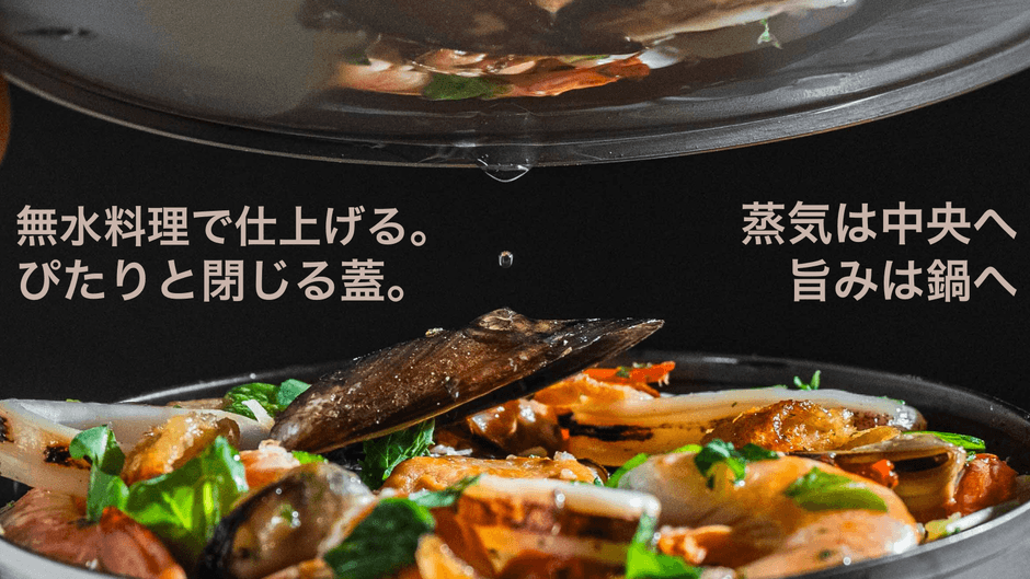 これにより、少ない水分でも調理できる無水調理が可能となり、食材本来の旨みを引き出します。
