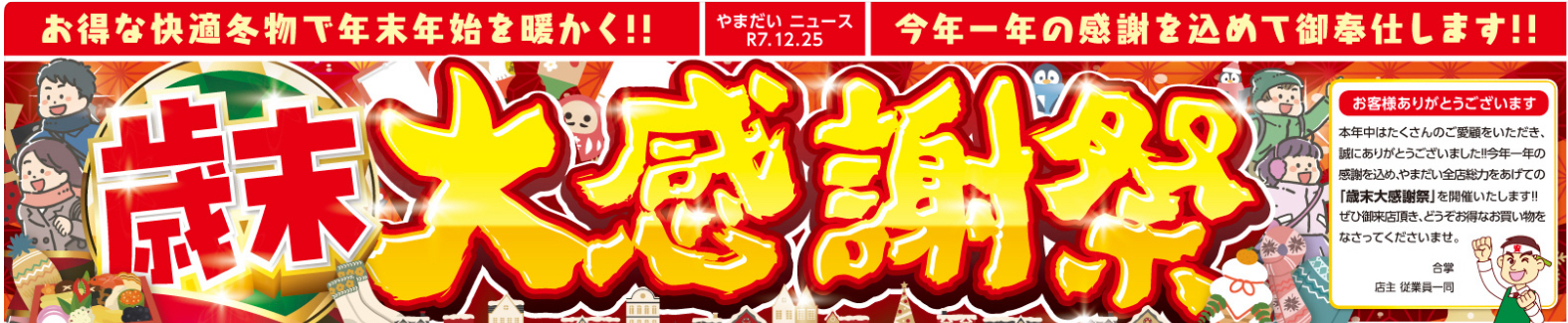 福岡県・熊本県を中心に総合衣料品販売を行う株式会社やまだい(所在地:福岡県筑紫野市二日市南3-7-8、代表取締役:山下 哲生)は、2025年12月25日から同12月31日までの7日間、ファミリーファッションやまだい全店において、「歳末大感謝祭」を開催いたします。