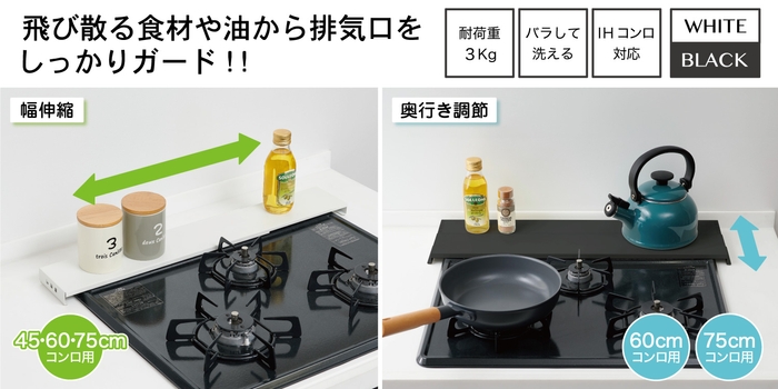 排気口の上に置くだけで油飛びや調味料汚れをしっかりガード!『幅伸縮タイプ』と『奥行き調節タイプ』の薄型排気口カバーを新発売!!