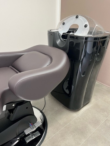 AHS-01(写真)は、AI機能と水素セラミックスを搭載し、心地よい水流を実現させパーマ剤やカラー剤もしっかり除去でき「髪にも頭皮にも優しい自動洗髪機」です。
