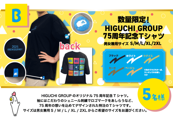 創業75周年を記念して製作された、完全非売品のオリジナルTシャツです。 背中には、HIGUCHI GROUPのロゴマークをカラフルに並べたバックプリントを施しました。サイズはS~2XLからお選びいただけます。カラーはどの色が届くかお楽しみに!