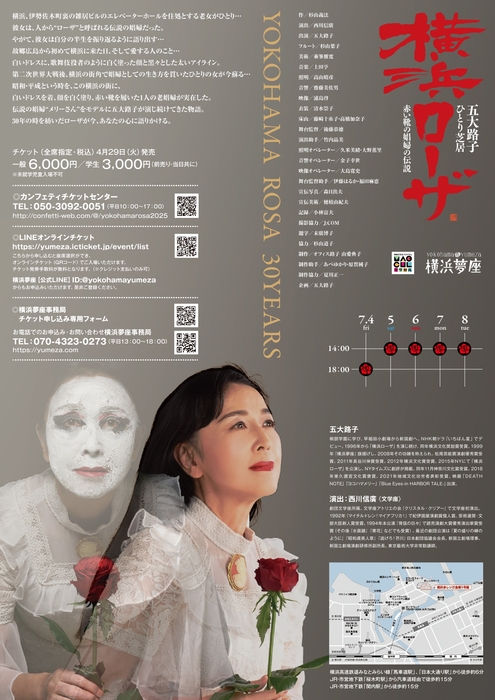 一般社団法人横浜夢座主催、【横浜夢座】戦後80年平和祈念三部作 第二弾五大路子ひとり芝居「『横浜ローザ』赤い靴の娼婦の伝説」が2025年7月4日 (金) 〜 2025年7月8日 (火)に横浜赤レンガ倉庫1号館3Fホール(神奈川県 横浜市中区 新港 一丁目1番1号)にて上演されます。 チケットはカンフェティ(運営:ロングランプランニング株式会社、東京都新宿区、代表取締役:榑松 大剛)にて発売中です。