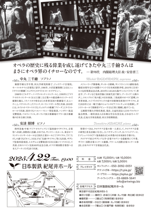 株式会社アートウィングス主催、DIVA Presents『中丸三千繪 ソプラノ・リサイタル』が2025年4月22日 (火)に紀尾井ホール(東京都 千代田区 紀尾井町 6番5号)にて開催されます。