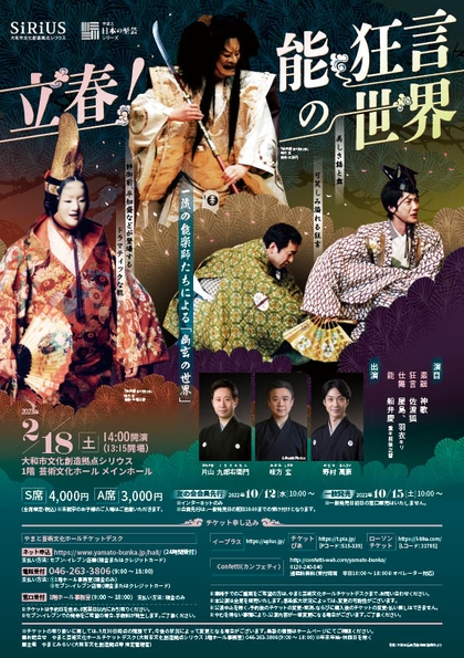 やまとみらい(大和市文化創造拠点等 指定管理者)主催、『立春!能・狂言の世界』が2023年2月18日 (土)にやまと芸術文化ホール メインホール(神奈川県大和市大和南1丁目8番1号)にて開催されます。初の公演を祝う、格式高い上演方式を採用。美しき「謡と舞」、可笑しみ溢れる「狂言」、静御前、平知盛、源義経、武蔵坊弁慶など、人気の高い人物が登場し、ドラマティックな「能」をお贈りします。