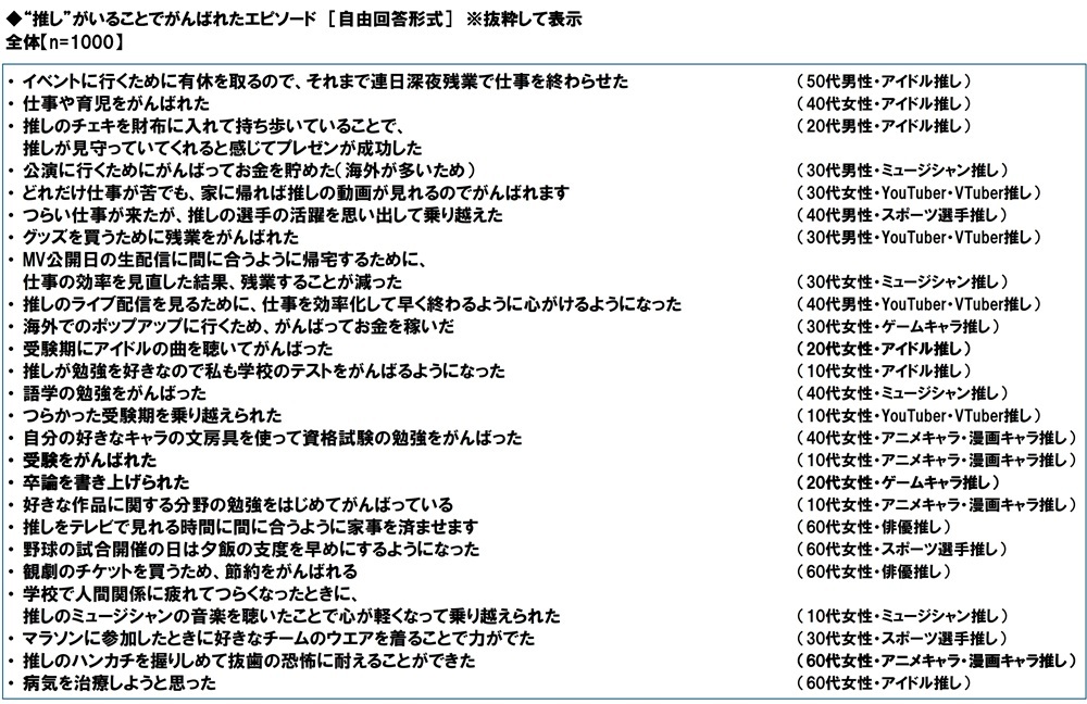 また、「野球の試合開催の日は夕飯の支度を早めにするようになった」や「観劇のチケットを買うため、節約をがんばれる」といった家事や節約をがんばっているというエピソード、「学校で人間関係に疲れてつらくなったときに、推しのミュージシャンの音楽を聴いたことで心が軽くなって乗り越えられた」、「マラソンに参加したときに好きなチームのウエアを着ることで力がでた」、「推しのハンカチを握りしめて抜歯の恐怖に耐えることができた」、「病気を治療しようと思った」など、さまざまな場面で、推しがいることで乗り越えられた、前向きになれたといったエピソードが見られました。