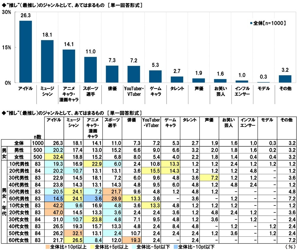 はじめに、全回答者(1000人)に、“推し”(最推し)のジャンルとして、あてはまるものを聞いたところ、1位「アイドル」(26.3%)、2位「ミュージシャン」(18.1%)、3位「アニメキャラ・漫画キャラ」(14.1%)、4位「スポーツ選手」(11.0%)、5位「俳優」(7.3%)となりました。