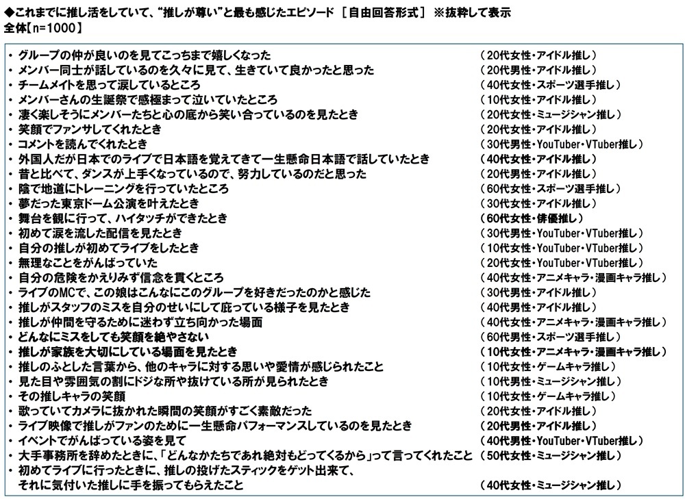 全回答者(1000人)に、これまでに推し活をしていて、“推しが尊い”(※)と最も感じたエピソードを聞いたところ、「メンバー同士が話しているのを久々に見て、生きていて良かったと思った」や「チームメイトを思って涙しているところ」、「凄く楽しそうにメンバーたちと心の底から笑い合っているのを見たとき」といった、同じチームやグループのメンバーへの思いを実感したエピソード、「昔と比べて、ダンスが上手くなっているので、努力しているのだと思った」や「陰で地道にトレーニングを行っていたところ」、「夢だった東京ドーム公演を叶えたとき」など、努力している姿や努力が報われる姿を見られたといったエピソードが挙げられました。