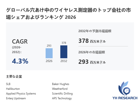 YHResearch調査チームの最新レポート「グローバル穴あけ中のワイヤレス測定器のトップ会社の市場シェアおよびランキング 2026」によると、2026年の293百万米ドルから2032年には378百万米ドルに成長し、2026年から2032年の間にCAGRは4.3%になると予測されています。