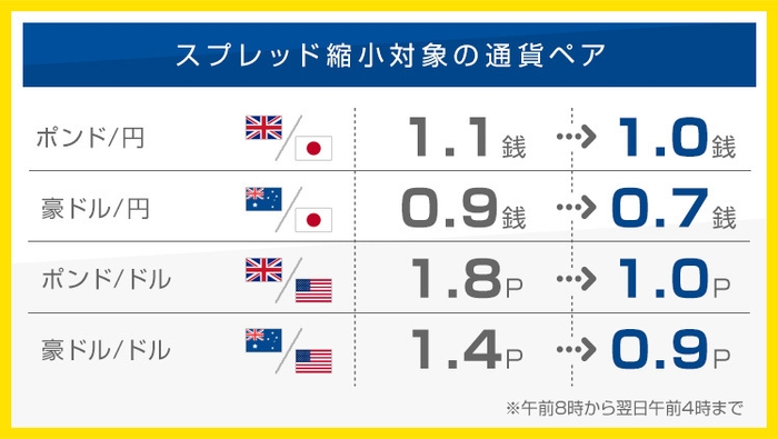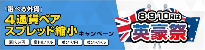 GMOインターネットグループのGMOフィナンシャルホールディングス株式会社の連結会社で、金融商品取引業を営む株式会社FXプライムbyGMO(代表取締役社長 安田和敏、以下 FXプライムbyGMO)は、外国為替保証金取引(FX)『選べる外貨』のうち、ポンド/円、ポンド/ドル、豪ドル/円、豪ドル/ドルについて、2021年8月2日(月)より、スプレッド縮小キャンペーンを開始いたします。