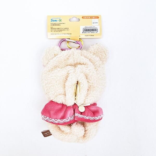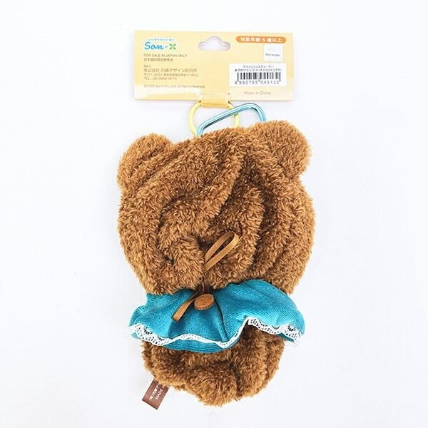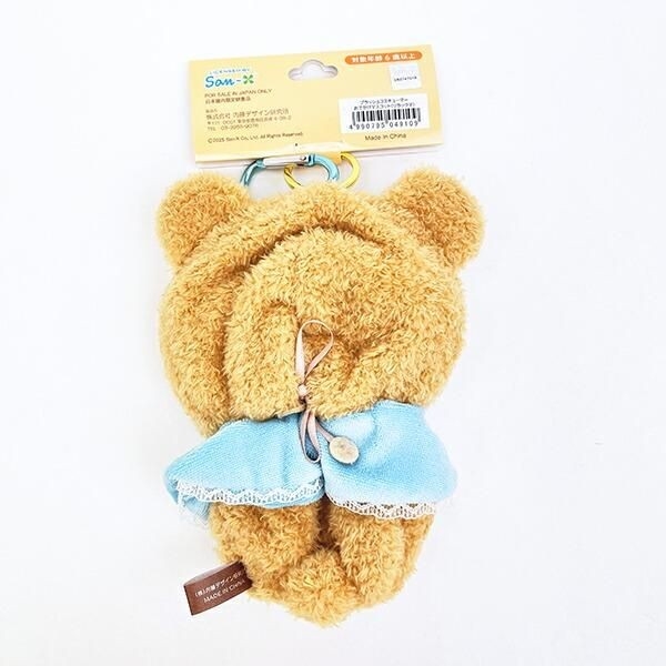 先ほどの濃いブラウンに、青色のお洋服がきれいな配色バランスです。カラビナもついているので、おめかしした推しのぬいぐるみをつけておでかけできるのでお出かけがもっと楽しくなりそうです。
