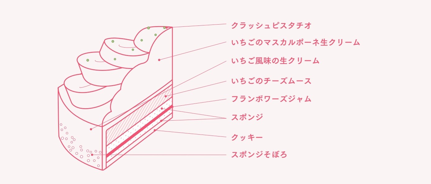 ふんわりのせた「いちごのマスカルポーネ生クリーム」の下には、北海道産のいちごをパティシエがひとつひとつ丁寧に裏ごししたピューレに、北海道産のクリームチーズとマスカルポーネチーズ、生クリームを使用した「いちごのチーズムース」、自家製のフランボワーズジャムやしっとりふわふわ食感のスポンジとクッキーが土台を支えます。