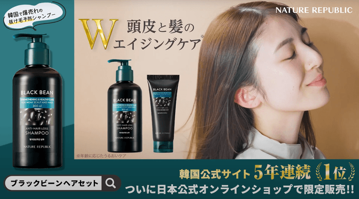 韓国自然派スキンケアブランド「ネイチャーリパブリック」から発売されている「ブラックビーン シャンプー」は、頭皮と髪のWエイジングケア※1ができ、根元から立ち上がるハリ・コシのある美髪へと導くヘアケア商品です。チェジュ島産黒豆エキス※2が頭皮と髪にうるおいを与え、泥の力※3でべたつきや毛穴の汚れをさっぱりと洗い上げます。