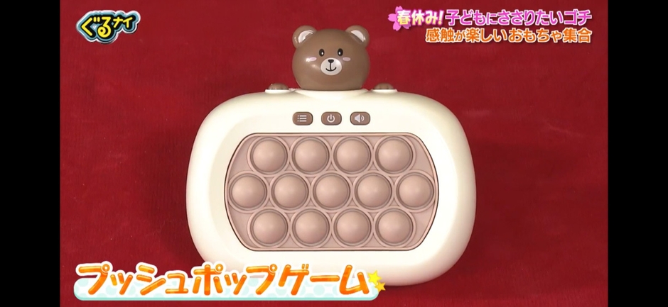 4月2日放送「子どもにささりたいゴチ」にて最新トレンドとして登場。 光と音に合わせてポコポコ押す、大人もハマるクセになる感触が大反響!