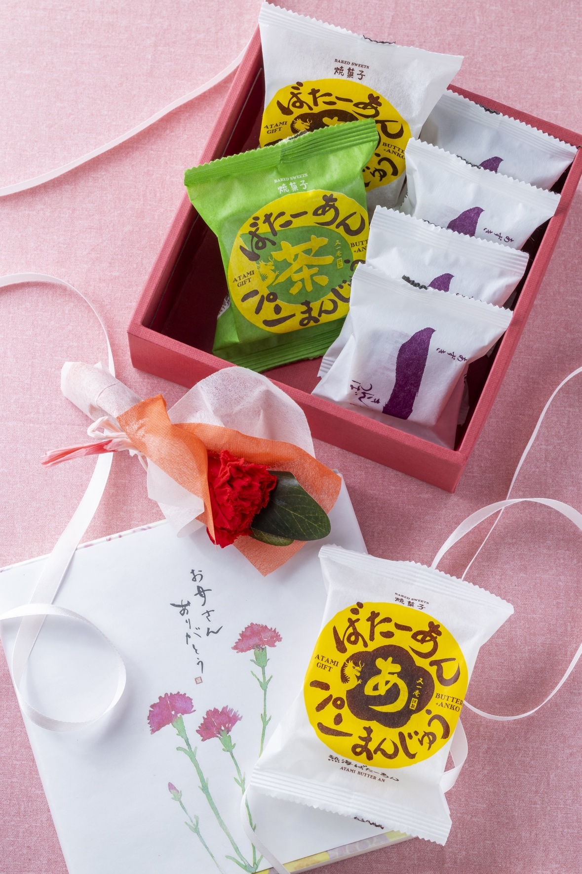 熱海ばたーあんが贈る『母の日ギフトセット』は、熱海ばたーあんパンまんじゅう小豆2個、熱海ばたーあんパンまんじゅう抹茶1個、きんつば小豆4個の詰め合わせです。5月10日(日)までの限定販売となります。