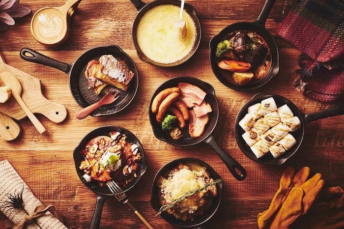 ホテルのメインストリート「ピーマン通り」には、寒い屋外でも暖を取れるように、薪ストーブを設置します。薪を使ったテーブルやベンチもあり、炎の揺らめきを眺めながらほっこりとした時間を過ごせます。薪割りの体験もでき、冷えた体を温めながら八ヶ岳の暮らしを感じられる空間です。また、ピーマン通りのレストランやカフェでは、スキレットを使った温かい冬のメニューが登場します。