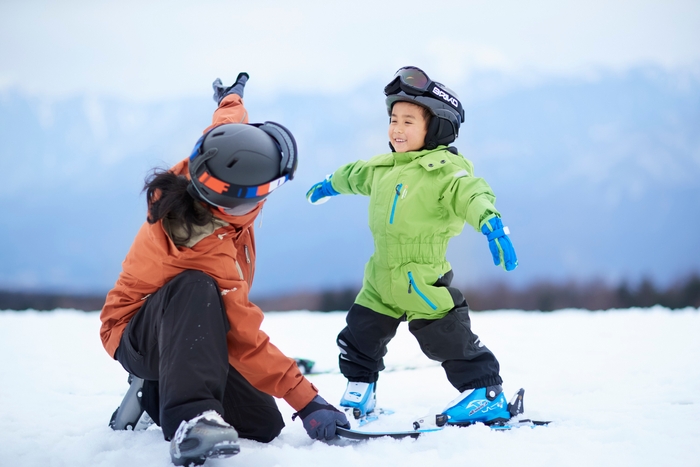 期間限定の平日に、宿泊者向けの無料グループスキーレッスンを開催します。はじめてスキーを体験する子どもを対象にしたレッスンで、スキーの履き方からスキーを履いて止まるところまで、子どものペースに合わせて学べるレッスンです。コースは未就学児向けと小学生向けの2つあるので、年齢に合わせて参加できます。