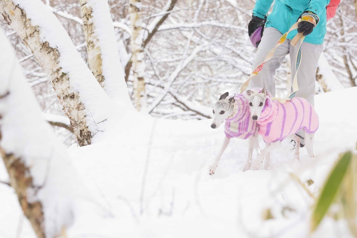スキーウェアやブーツ、板などのスキーギアは大人から子ども向けまで揃い、宿泊者は無料でレンタルできるので、手ぶらで来てもスキーを楽しむことができます。スキーウェアはサイズやデザインが豊富なので、友達同士やファミリーでおそろいのコーディネートをすることも可能。また、レジデンスペットテラス付に宿泊のゲストには、犬用ソリを用意するので、ペットと一緒に雪遊びを楽しめます。