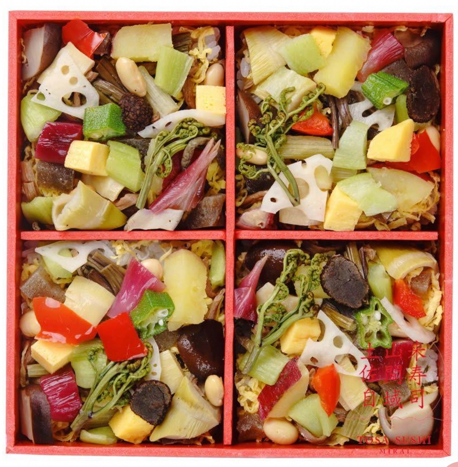 従来の「田舎寿司」からの「進化系」をうたい、具材にサツマイモのレモン煮や、パプリカなど従来にない味を加え、20種類以上のネタを使いちらし寿司も作りました。
