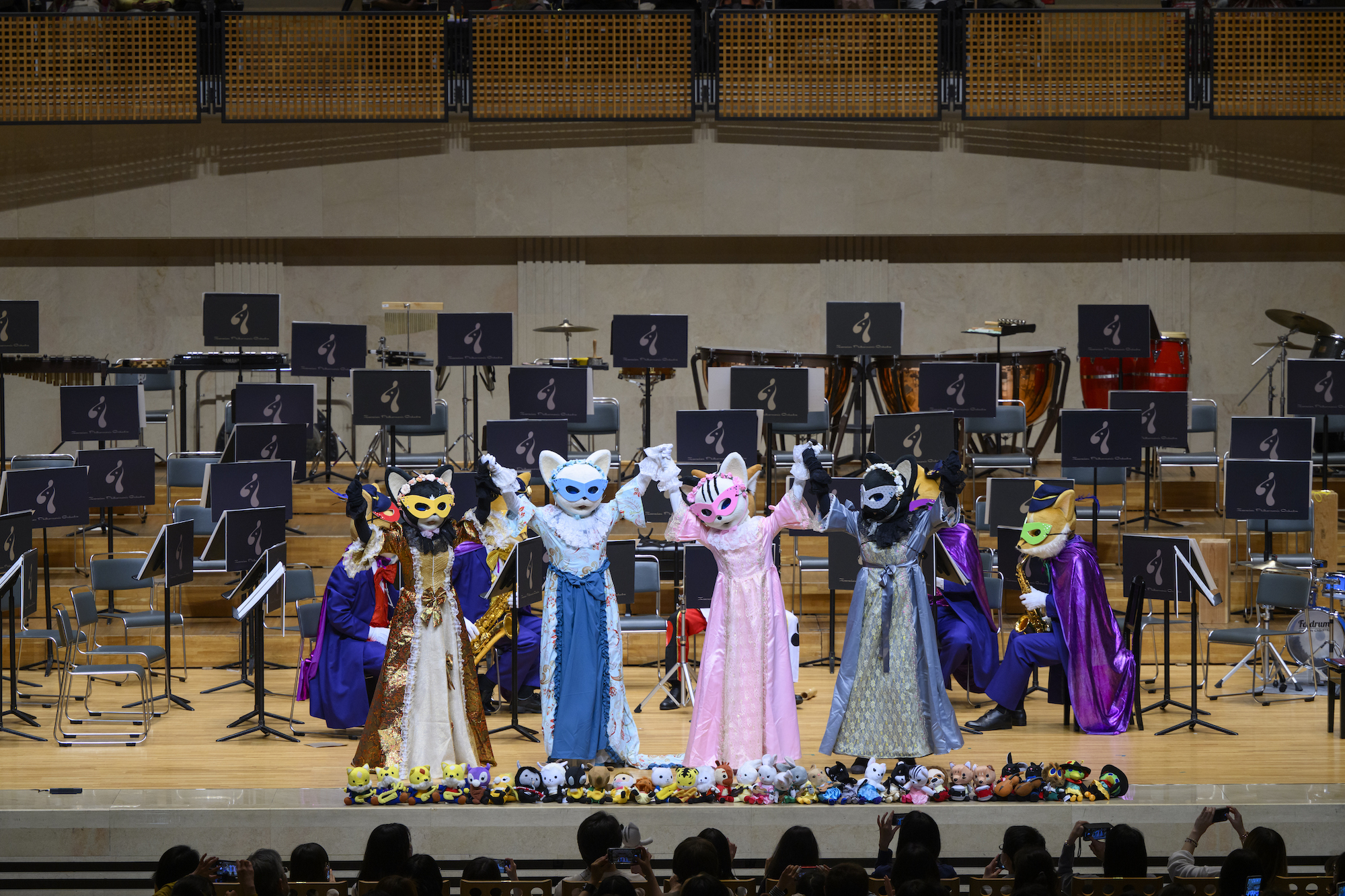 年に一度の舞踏会。動物たちはカーニバル衣装で登場します。花かんむりをつけたり、マントを着たり、それぞれおしゃれを楽しんでいます。特に女の子たちに人気なのはとっても華やかな弦うさぎの四姉妹のドレス。花柄の可愛らしい衣装が印象的です。クラリキャットの4名も色違いのロングドレスで登場。みんながヴェネツィアのカーニバルをイメージしている中、“カーニバル”違い…リオのカーニバルを彷彿とするサンバ衣装を着た動物も。