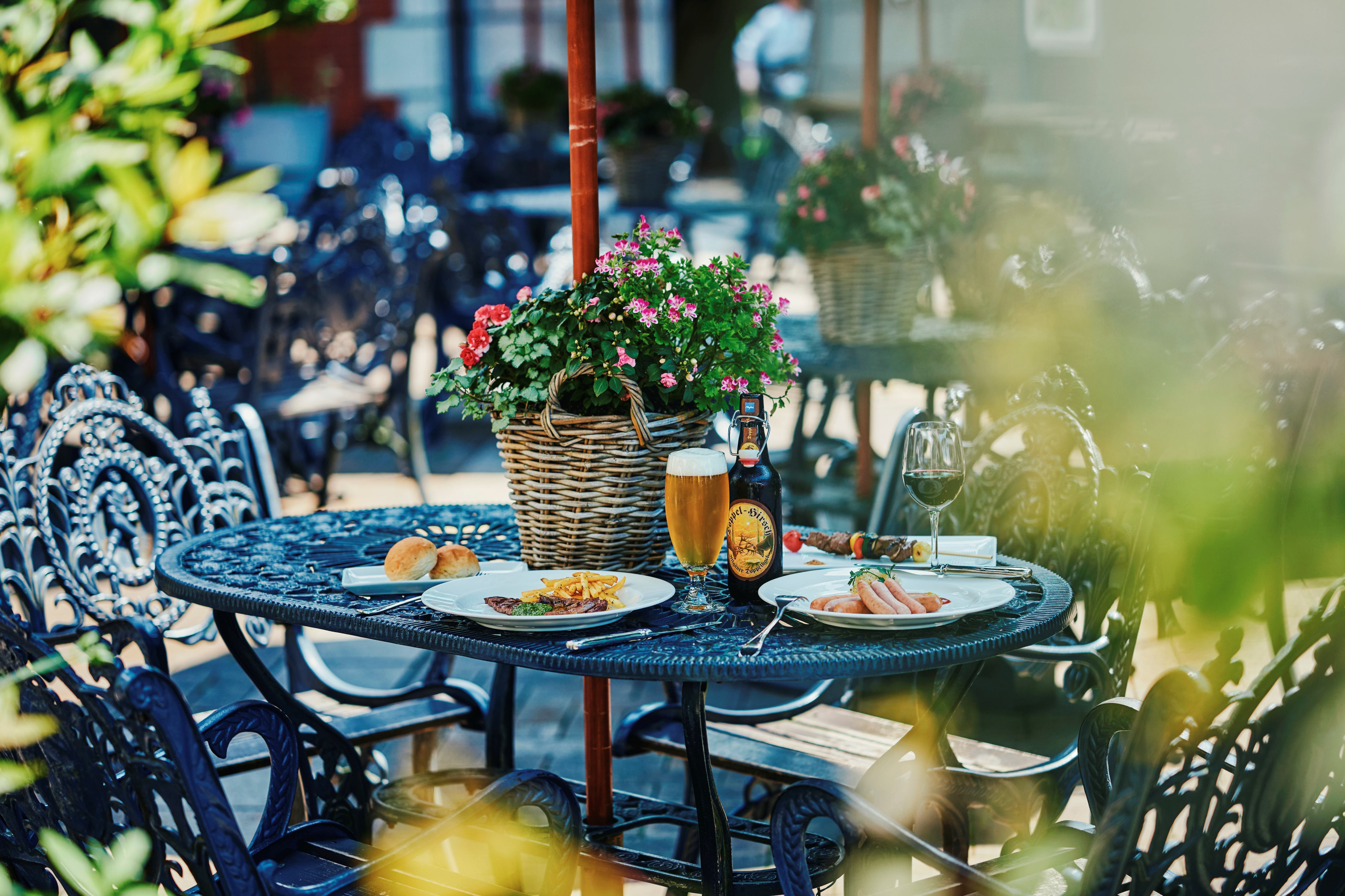 「ガーデンテラス」には、新たに水盤が設置され、ラグジュアリーなソファやパラソル席が並びます。優雅なひと時をお過ごしいただけます。