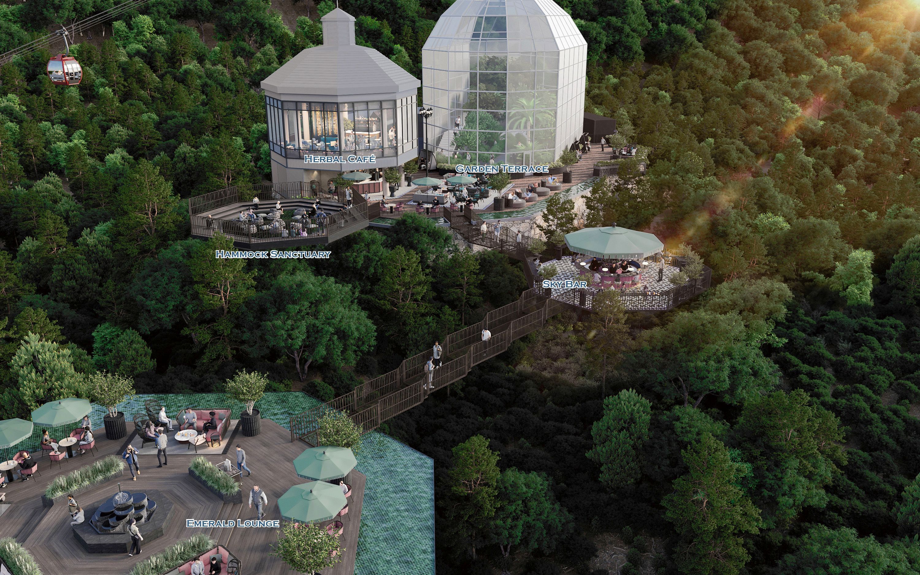 (2)既存テラスを「ガーデンテラス」として改修・拡張し、さらには、正八角形の3つの新スポット「エメラルド ラウンジ」「スカイバー」「ハンモック サンクチュアリ」が有機的に森の中に浮かぶように配置されています。