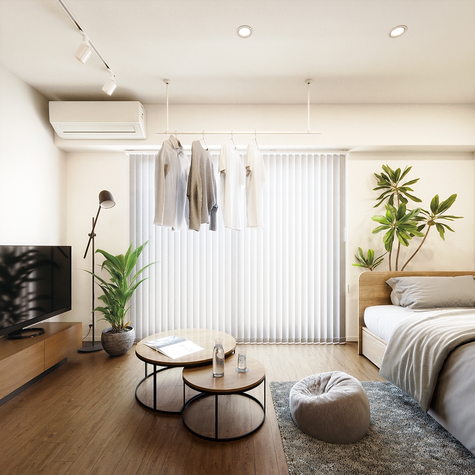 現代のライフスタイルに合わせて高まる「室内干し」ニーズに対応した、スタイリッシュで高機能な室内物干しです。ワンタッチで着脱できる吊りポールにより、使わないときはすっきり収納可能です。また、製品全体をマットな質感で統一し、生活感を抑えた空間になじむデザインにしました。さらに、「ゆれピタ機能」による揺れの軽減や、最大2,340mmまで伸縮できる本体バーなど、使い勝手にも優れています。