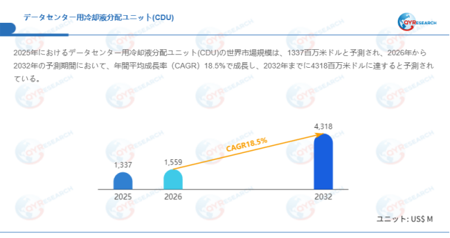 QYResearchが発表した新たな市場調査レポート「データセンター用冷却液分配ユニット(CDU)―グローバル市場シェアとランキング、全体の売上と需要予測、2026~2032」によると、世界のデータセンター用冷却液分配ユニット(CDU)市場規模は2025年の約1337百万米ドルから2026年の1559百万米ドルへと順調に拡大すると見込まれ、予測期間中は年平均成長率(CAGR)18.5%で成長し、2032年には4318百万米ドルに達すると予測されている。