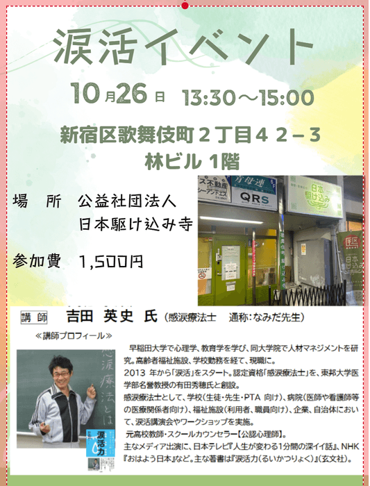 通称「なみだ先生」として、企業・自治体・教育機関・医療機関・福祉施設向けの「涙活(るいかつ)」講演などを手がけている、感涙療法士の吉田英史は、2025年10月26日(日)に公益社団法人日本駆け込み寺で、共感力や自己肯定感を高める「涙活」のイベントを実施します。