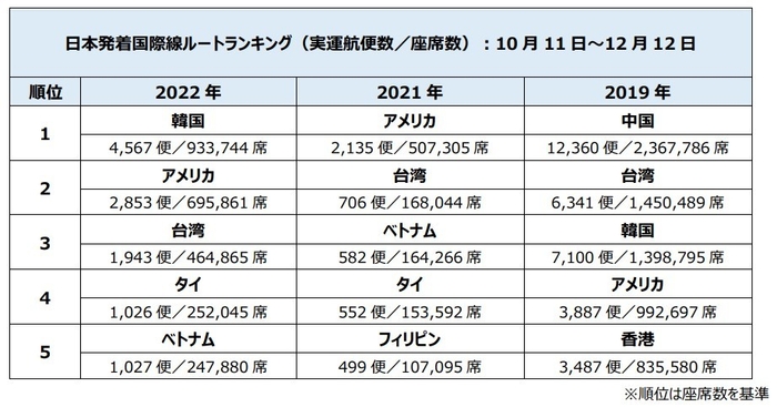 水際対策緩和が適用された10月11日~12月12日の日本発着の国際線のルートの実運航便数と座席数を調査したところ、韓国が最も人気のルートであることが分かりました。韓国は2019年に3位にランクインして以来のトップ5入りとなりました。一方、2019年に1位の中国は、コロナ政策などが影響した可能性があり、2021年と2022年ではトップ5から外れています。