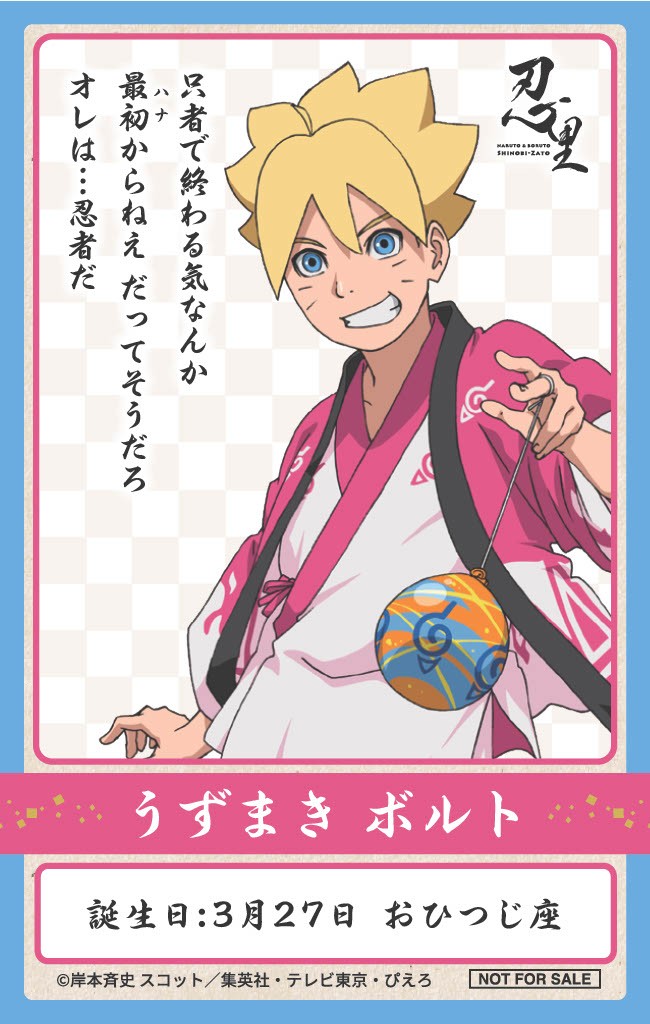 これまでに「NARUTO&BORUTO 忍里」のために描き下ろされたイラストを使用した、オリジナルバースデーステッカーをご用意。イベント期間中に、「“キャラクター名”の誕生日をお祝いしにきた」とスタッフに伝えることでバースデーステッカーを手に入れることができる。