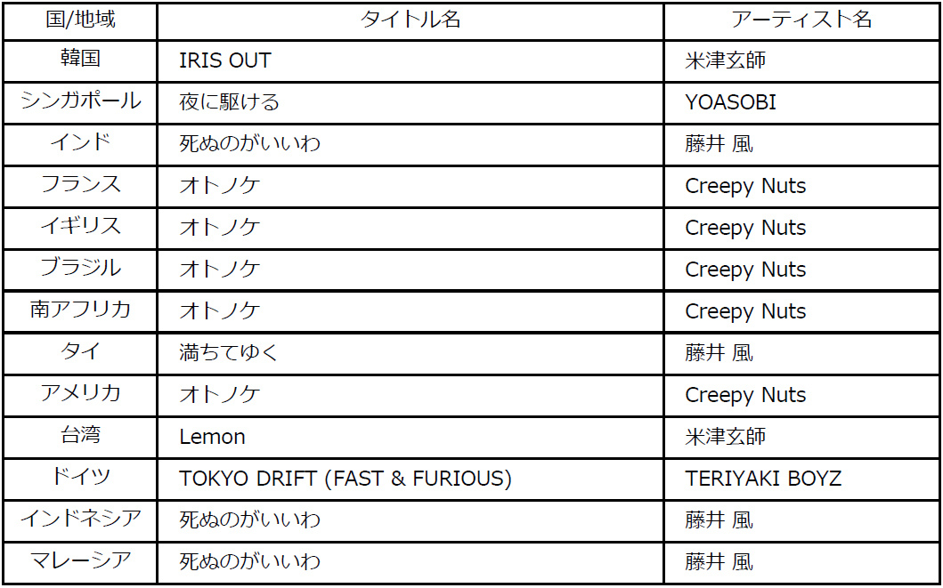日本人アーティストによる海外公演の活発化、国際音楽賞【MUSIC AWARDS JAPAN】の開催など、音楽のグローバル化の機運が高まる昨今。世界でヒットしている日本の楽曲チャート“Global Japan Songs Excl. Japan”では、Creepy Nuts「オトノケ」が首位を獲得しました。加えて、Japan Songs(国/地域別チャート)では、5つの国と地域で首位に輝きました。