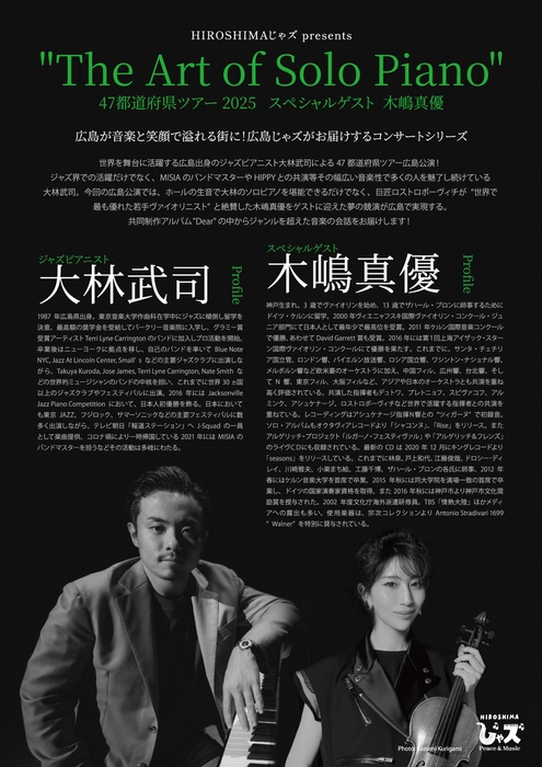 今回の広島公演では、ホールの生音で大林のソロピアノを堪能できるだけでなく、巨匠ロストロポーヴィチが“世界で最も優れた若手ヴァイオリニスト”と絶賛した木嶋真優をゲストに迎えた夢の競演が広島で実現します。